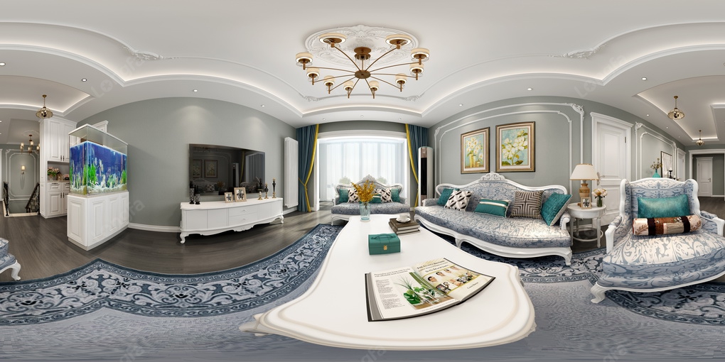 浅蓝色纹路的组合沙发,雕花石膏线,浅灰色壁纸,一系列的法式元素构成了这幅简约法式的图片。