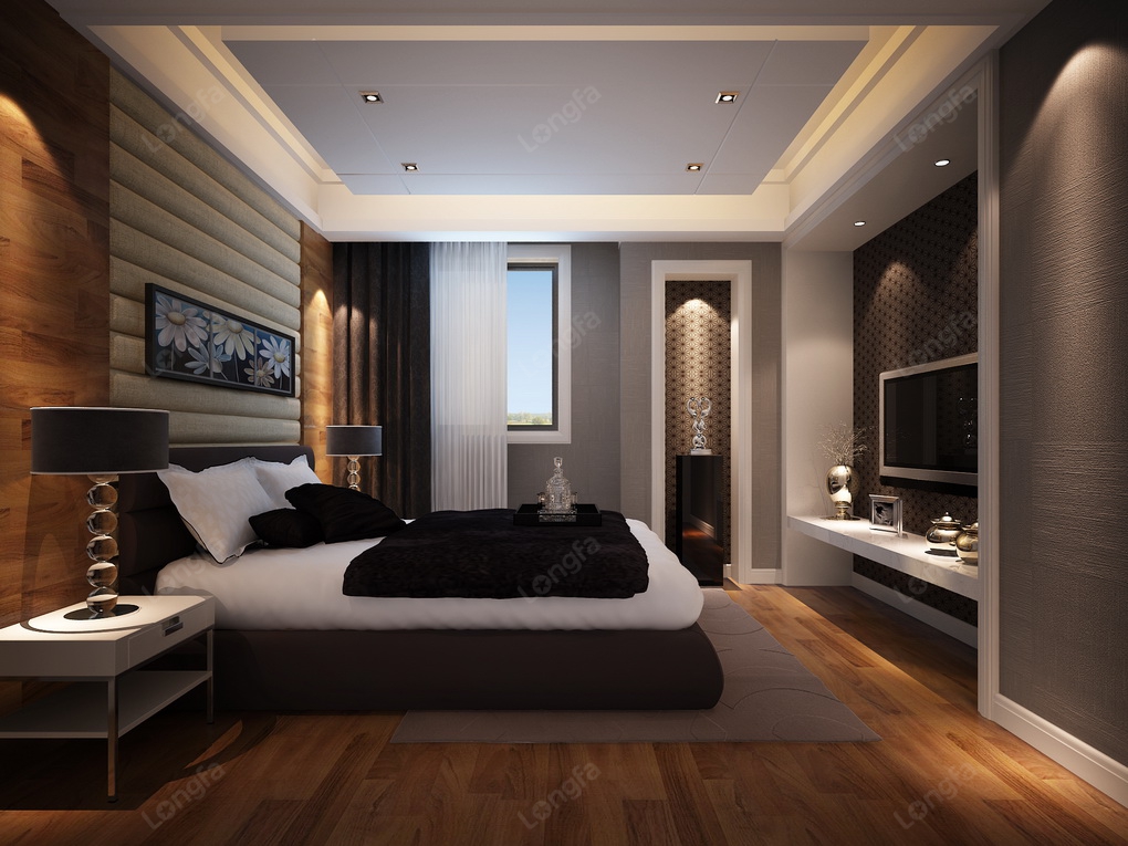 主卧作为居家休息的主要活动区域,以舒适和温馨为主,为了更好的睡眠空间卧室并没有采用跟动态空间一样的明亮空间。而是采用暗色系主打宁静祥和的氛围。