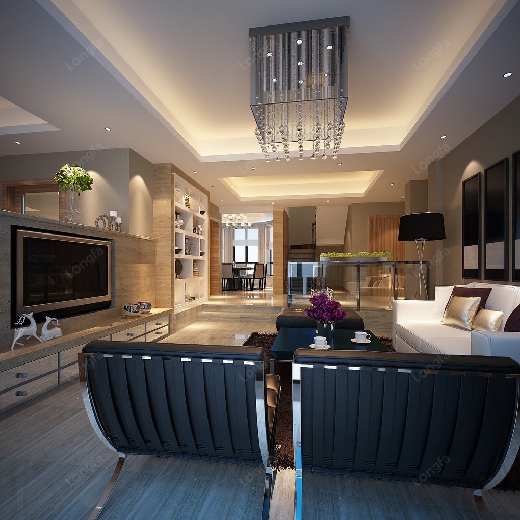 业主崇尚自然雅气,回归自然感觉,采用原木色实木地板,书柜电视柜及背景墙形成一个整体,线条流畅大气,简易的直线吊顶搭配上垂钓水晶琉璃坠,进口埃及水晶点缀