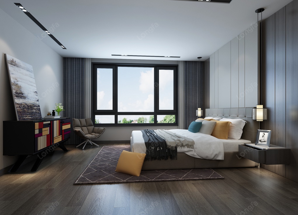 主卧室的设计,延续着整个室内设计效果图的现代简约风格,设计师巧用黄色和蓝色抱枕来作为空间的色彩点缀,使得主卧沉稳而不失活泼,再搭上极简的床头柜、一幅装饰画,展现了本案别墅空间设计极为个性的时尚美学,让业主在忙碌的都市生活里,享受到宁静的生活。