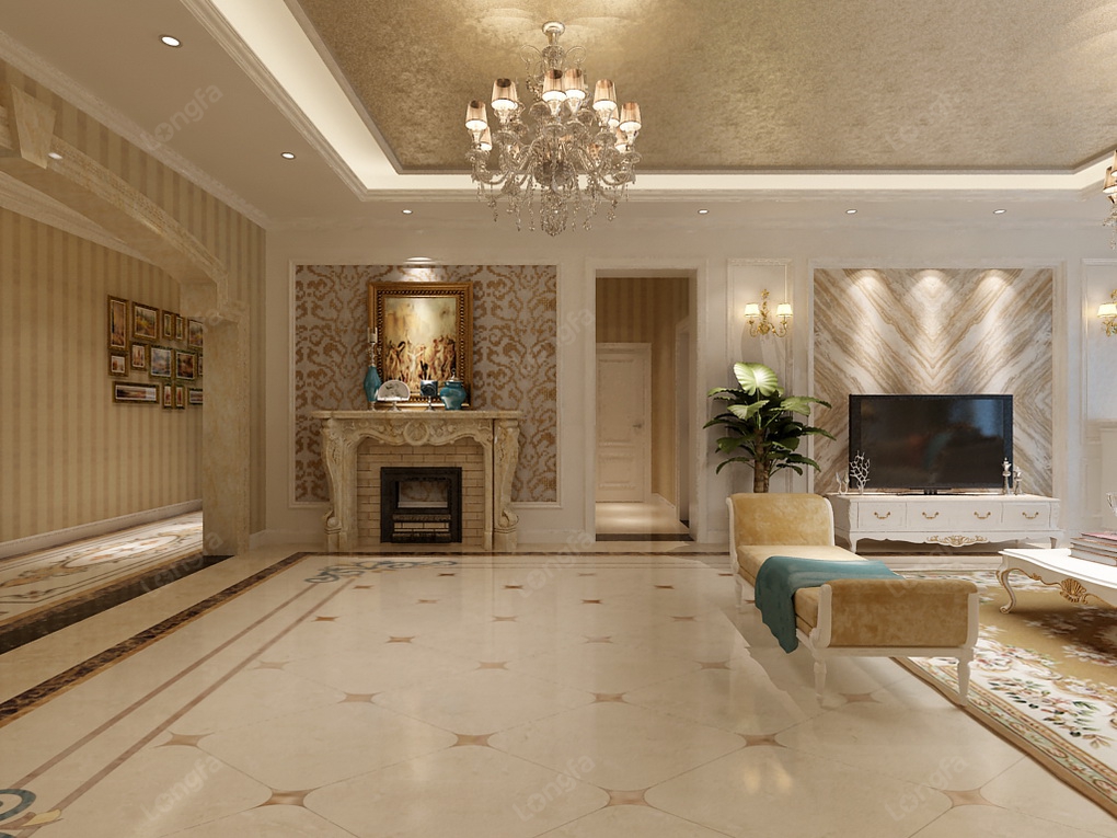 客厅以奢华大气为主,暖色调配饰搭配布艺凸显豪华气质,顶面奢华天花与地面拼花相呼应,