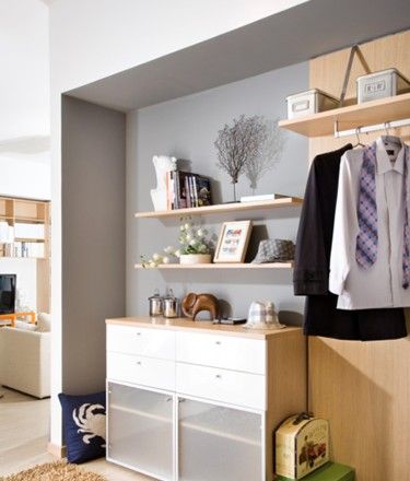 小玄关空间一般都是呈窄条形的,这样的玄关通常给人狭小阴暗的印象。所以建议这类玄关只在单侧摆放一些低矮的鞋柜,而上面的墙壁可以直接安装一个横杆直接架衣服。如果有需要,就安装一个单柜来收纳一些衣服,切忌柜子不能太多,否则会使本来就狭窄的空间更加拘谨。