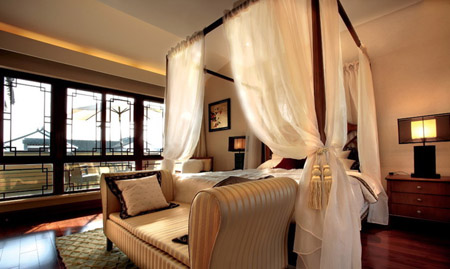 将帷幔的设计局限于床头,与其说具备实际的遮挡作用还不如说就是为了纯粹装饰而进行的设计。上图中向我们展示了帷幔设计,温和中透露出淡淡的高雅,成为卧室软装饰中的一处妙笔。